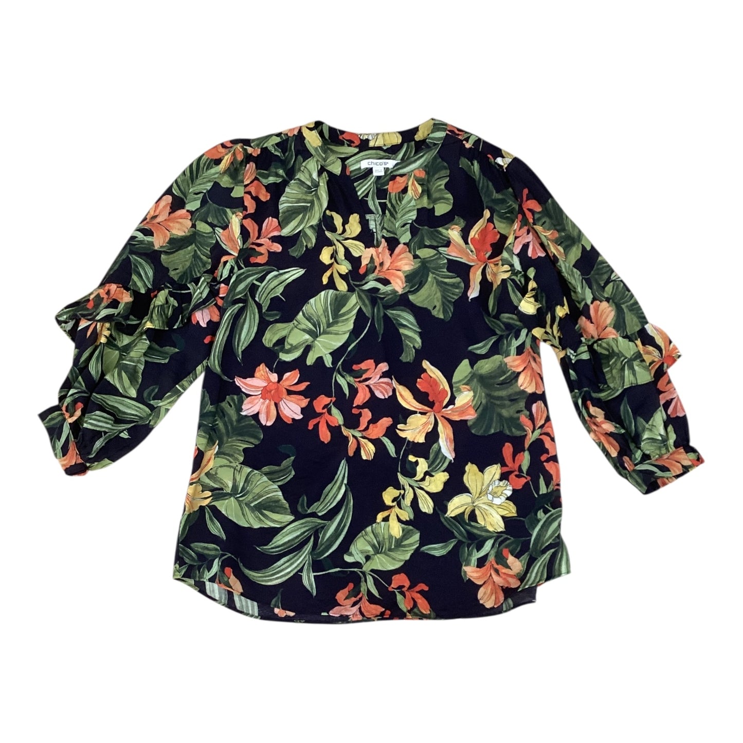 Elevate your style with this sophisticated navy top from Chicos. The 3/4 sleeves and flattering fit of Size 0 add a touch of elegance to any ensemble.